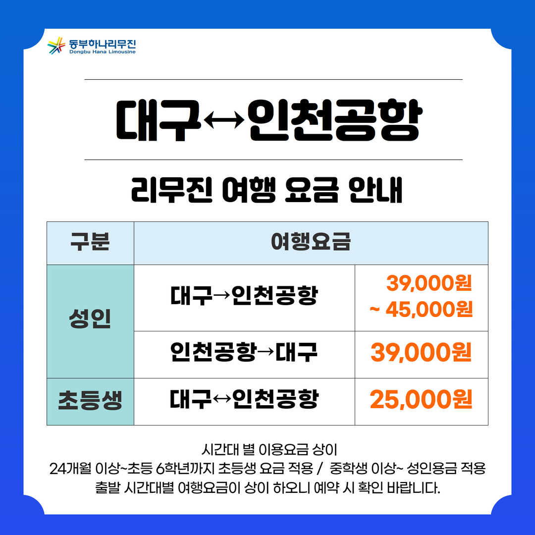 대구↔인천공항 리무진 여행이용 요금 안내